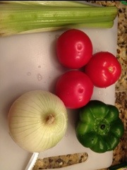 - Place bell pepper, onion, celery, carrot and cilantro in a food processor and chop fine.